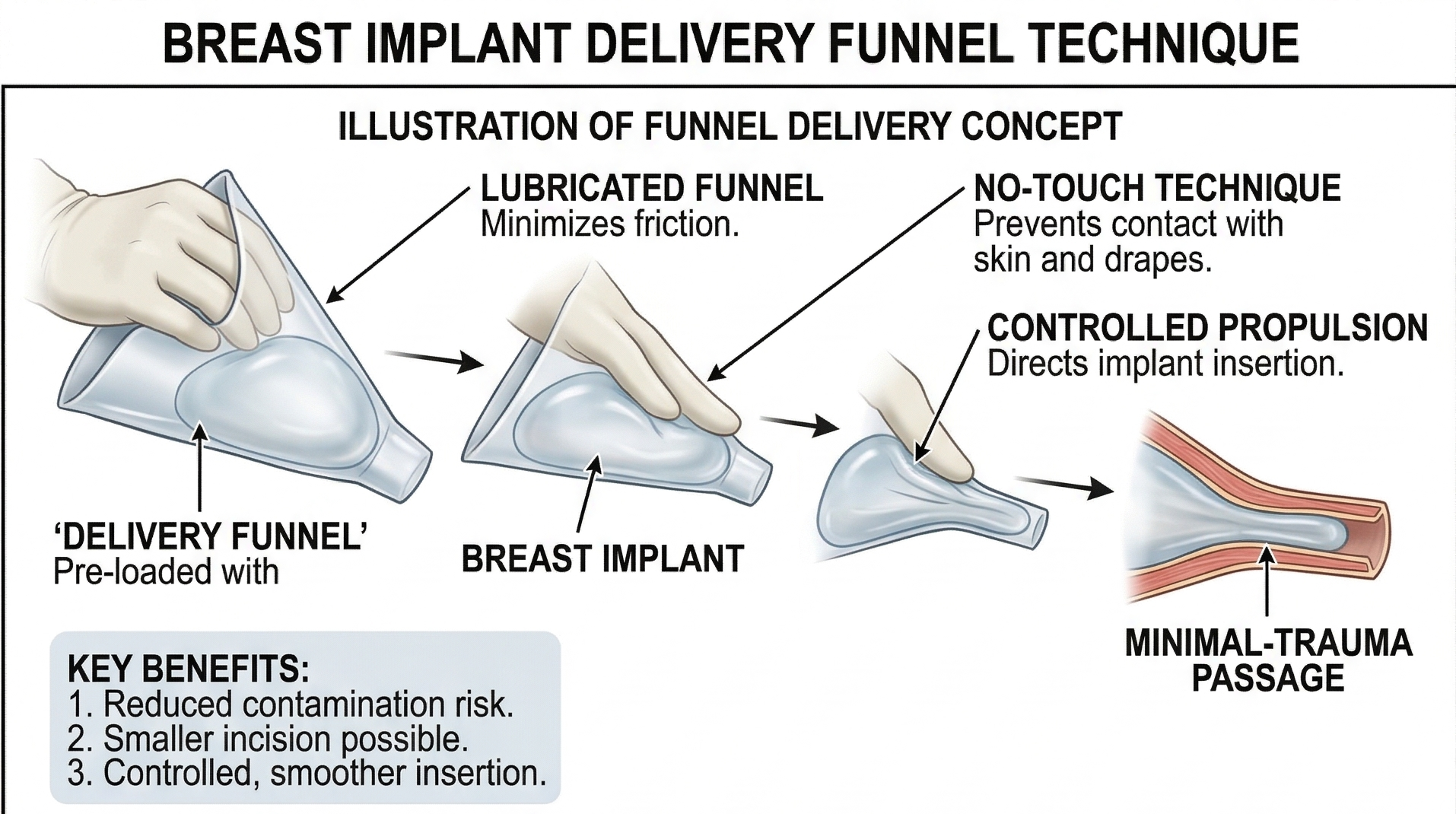 The cone-shaped delivery funnel is the most widely studied device, but other validated approaches exist. Some plastic surgeons use light-handle covers or reversed surgical glove sleeves built on the same principle: creating a sterile, low-friction barrier between the implant and the skin. The specific device matters less than the commitment to no-touch principles. What you want to avoid is any technique where the implant is pushed through the incision by hand with direct skin contact.